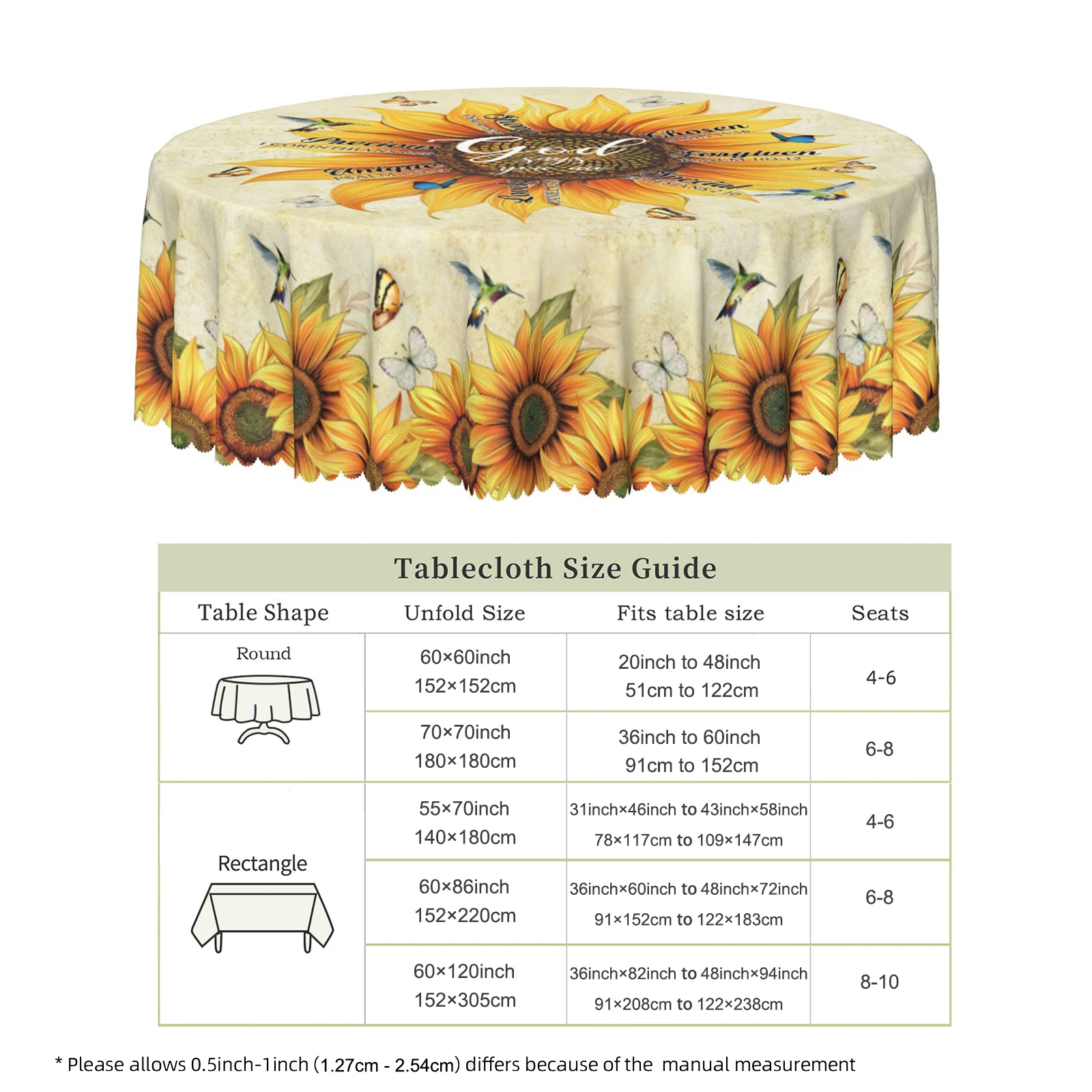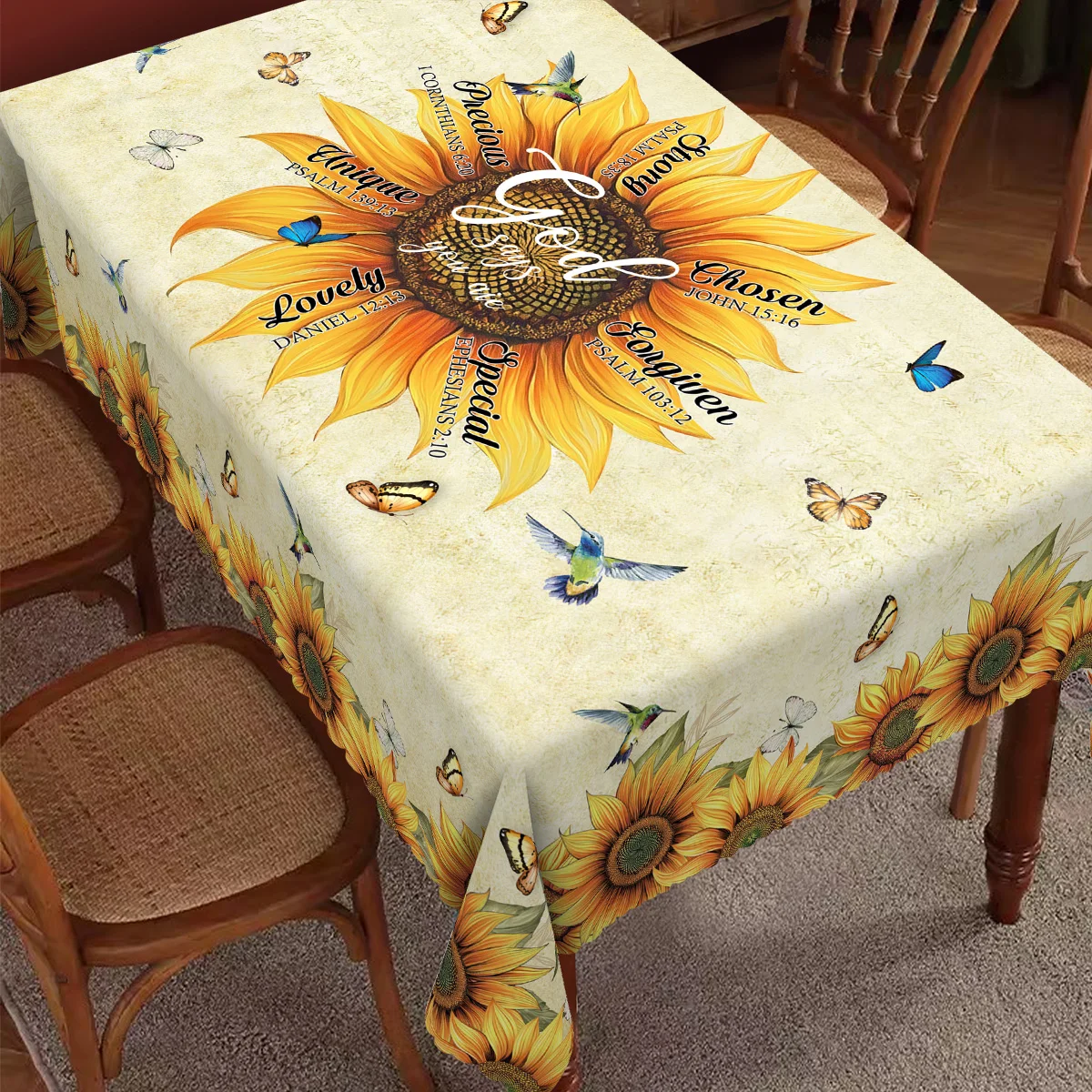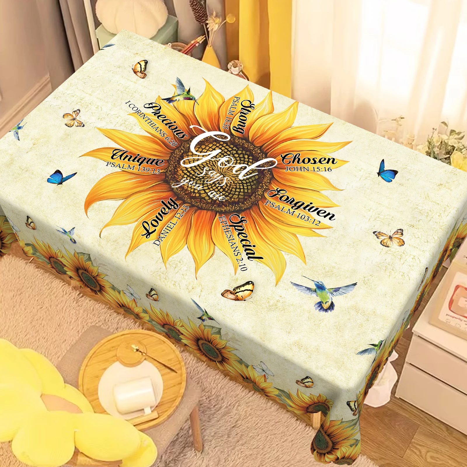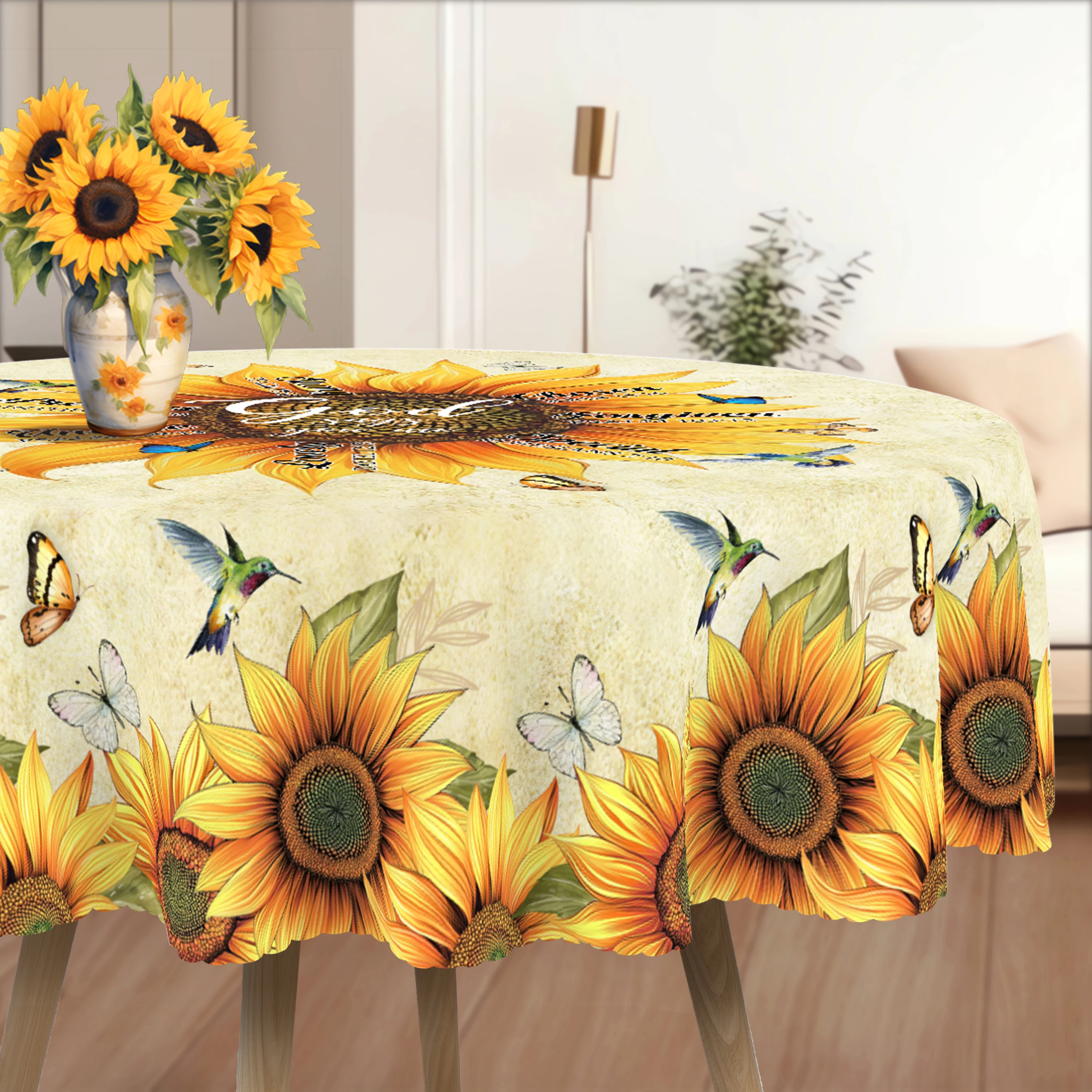 Crafted from premium polyester fabric, this tablecloth boasts a supple yet crisp texture that resists wrinkles. it's also waterproof, stain-resistant, and easy to care for. spills like oil or drink stains wipe right off with a damp cloth. machine washable, it maintains its shape and color, keeping the sunflower and print vibrant for years to come. the edges feature an embossed design, echoing the texture of sunflower petals and butterfly wings, preventing fraying and unraveling. from the materials to the details, durability is paramount, making it perfect for long-term, repeated use.