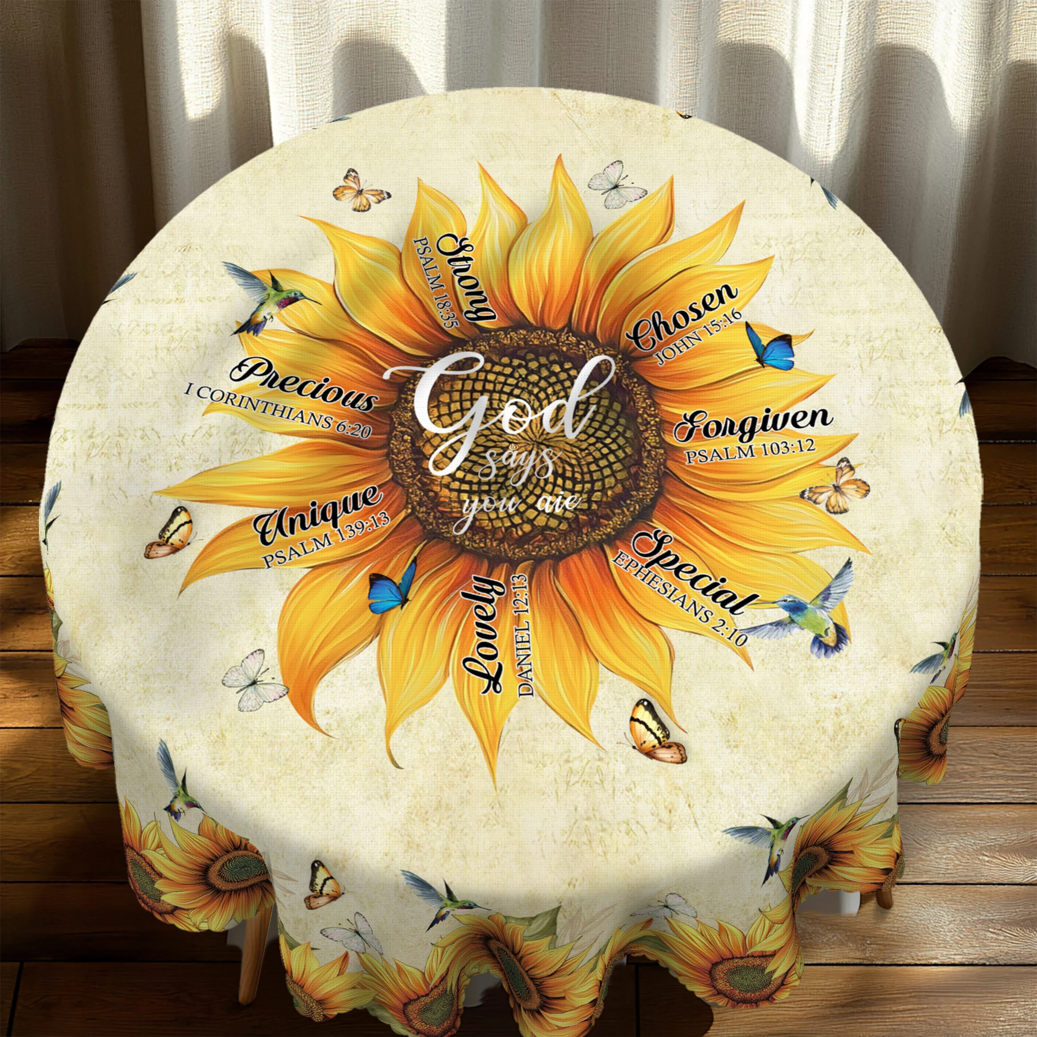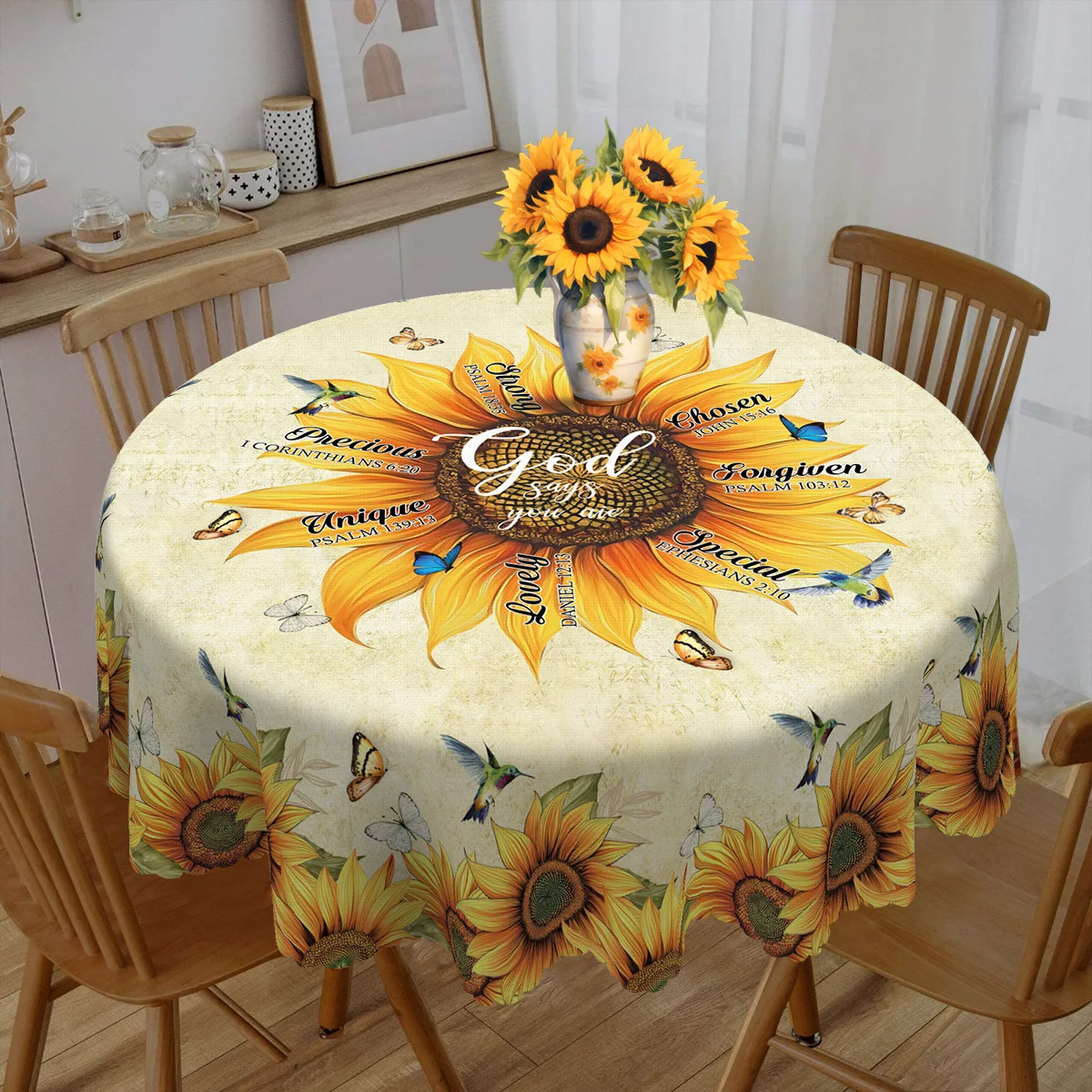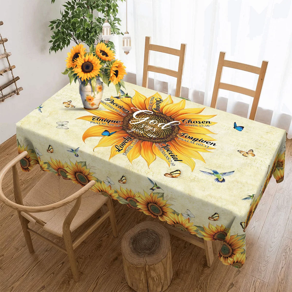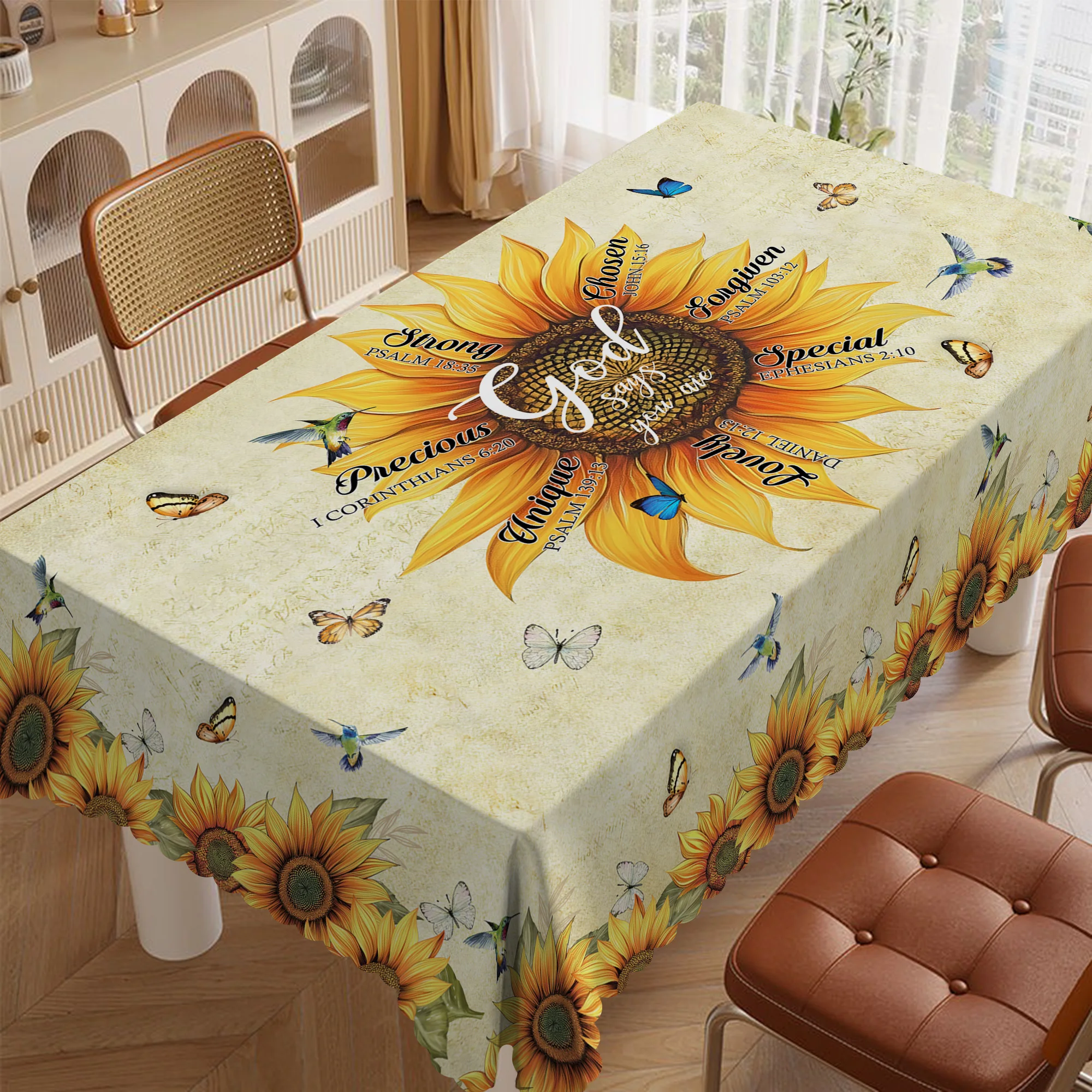 Crafted from premium polyester fabric, this tablecloth boasts a supple yet crisp texture that resists wrinkles. it's also waterproof, stain-resistant, and easy to care for. spills like oil or drink stains wipe right off with a damp cloth. machine washable, it maintains its shape and color, keeping the sunflower and print vibrant for years to come. the edges feature an embossed design, echoing the texture of sunflower petals and butterfly wings, preventing fraying and unraveling. from the materials to the details, durability is paramount, making it perfect for long-term, repeated use.