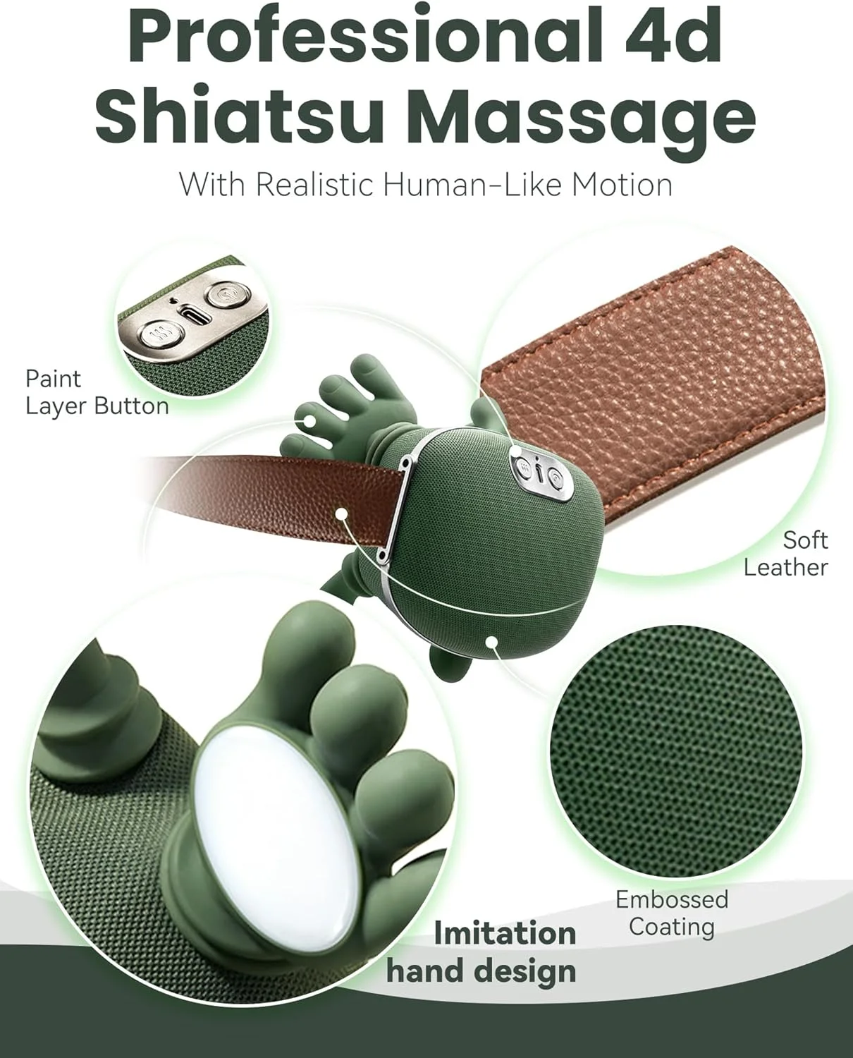 4D kneading massage for neck and shoulder relaxation: The acupressure neck and back massager offers a 4D kneading massage, delivering a comfortable massage experience and relieving tension in the neck muscles. The upper massage head mimics the physiological curvature of a grasping palm, fully enveloping the cervical spine. The lower massage head simulates the action of a human thumb, pushing and pressing on the shoulders and back.