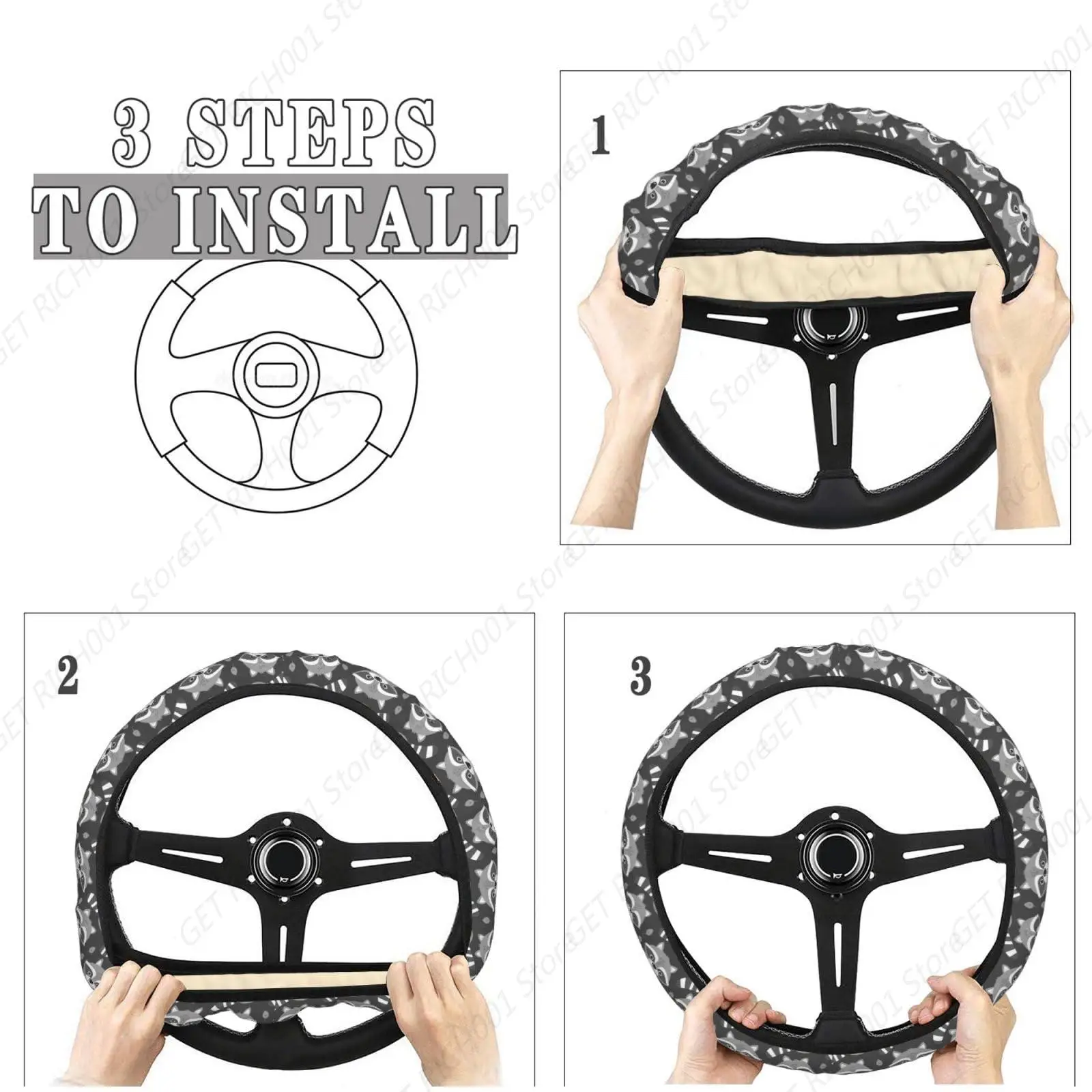 EASY TO INSTALL & WASHABLE: Because of the ductility material, anyone can easily install this steering wheel cover without tools. Install the top of the cover over the top of the steering wheel, center the steering wheel and stretch the sides of the cover until it fits the wheel perfectly. The steering wheel cover is washable and will not shrink, fade, or any other damage