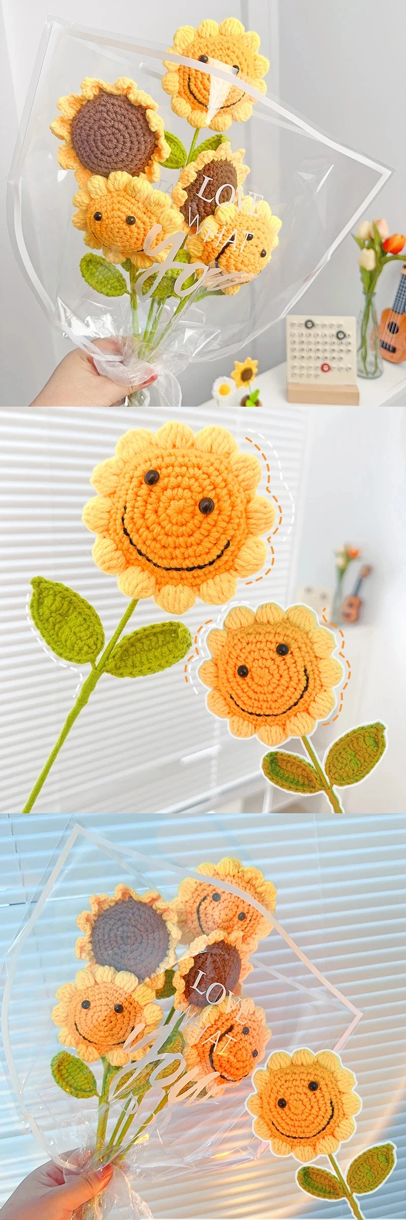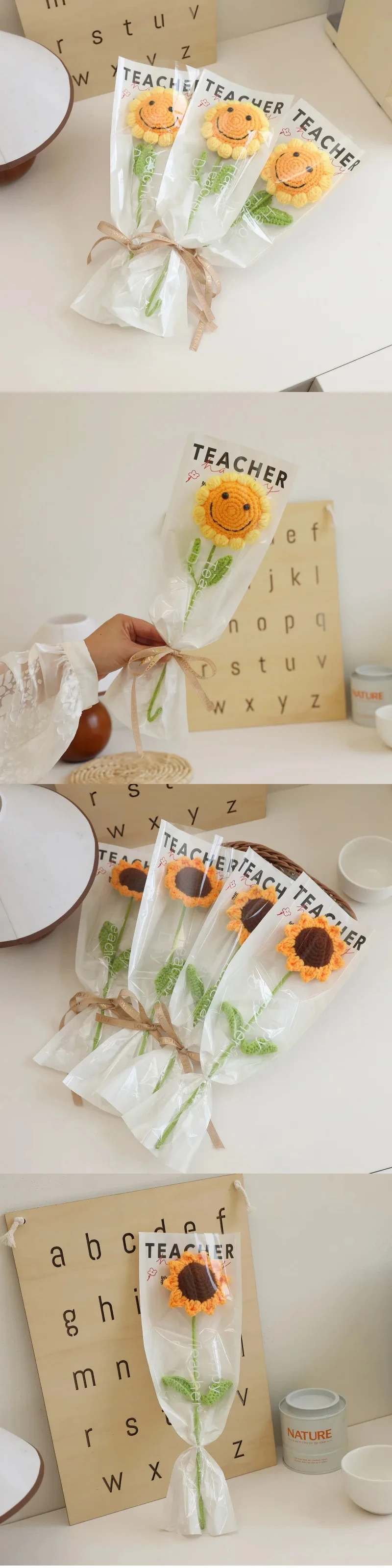 Hand-Knitted Crochet Flowers Smile Face Sunflower Artificial Single Bouquet Mother's Day Teacher's Day Gift Fake Floral