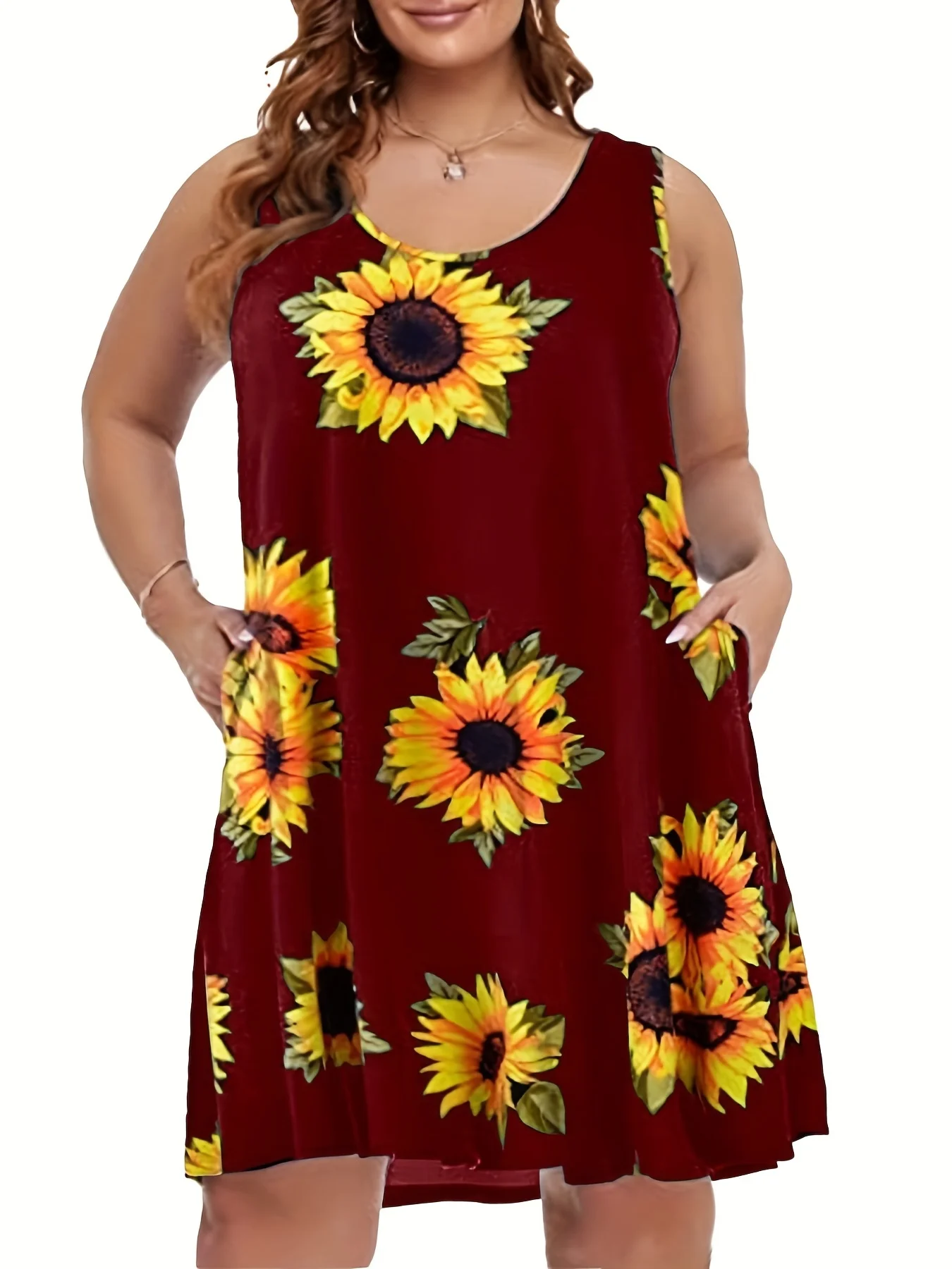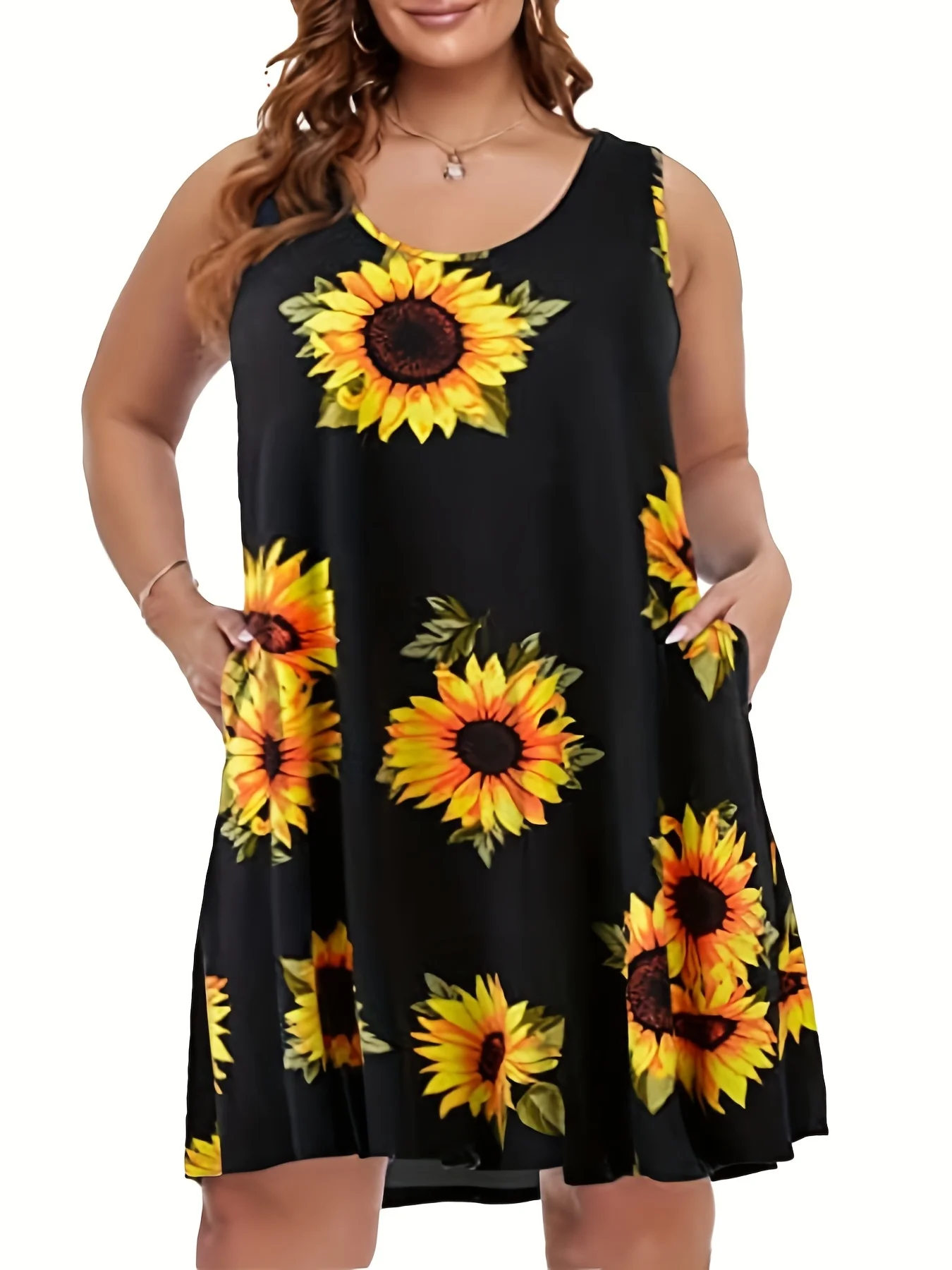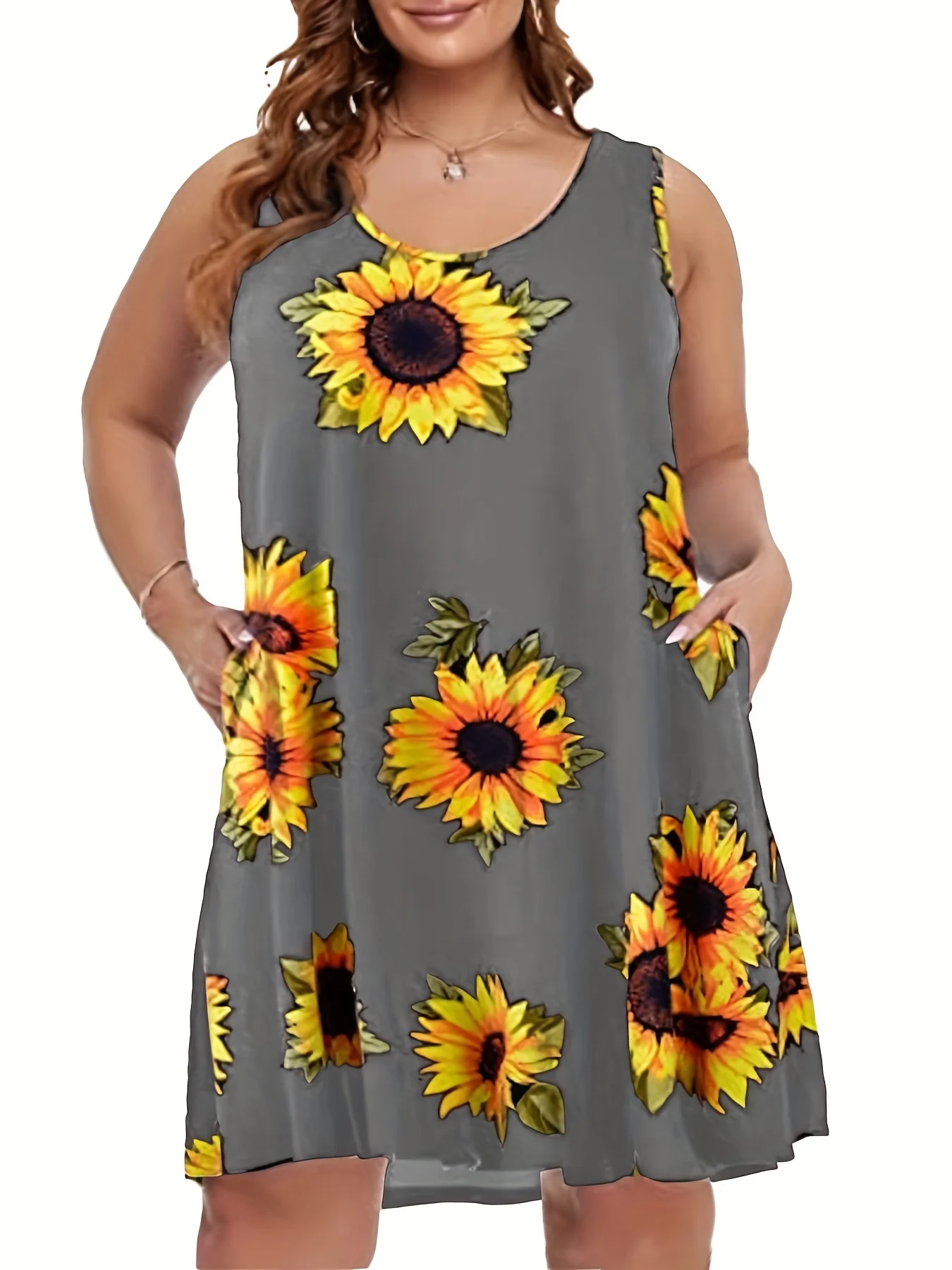 Sunflower Print Ruched Round Neck Tank Dress With Pockets