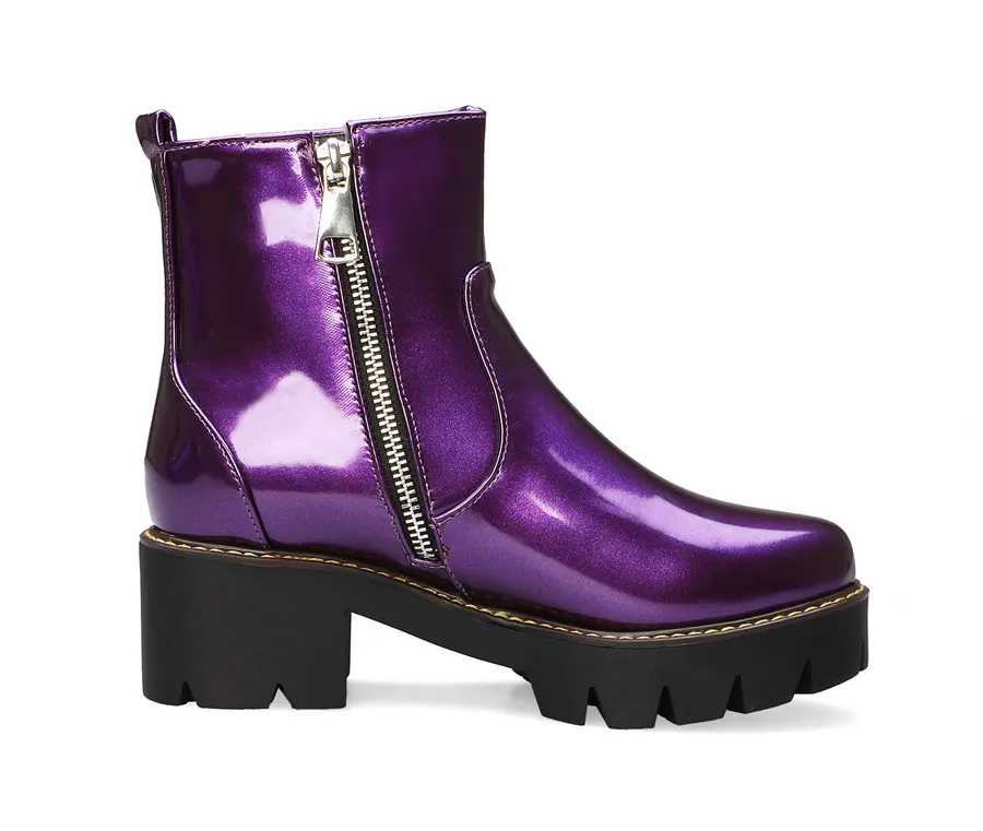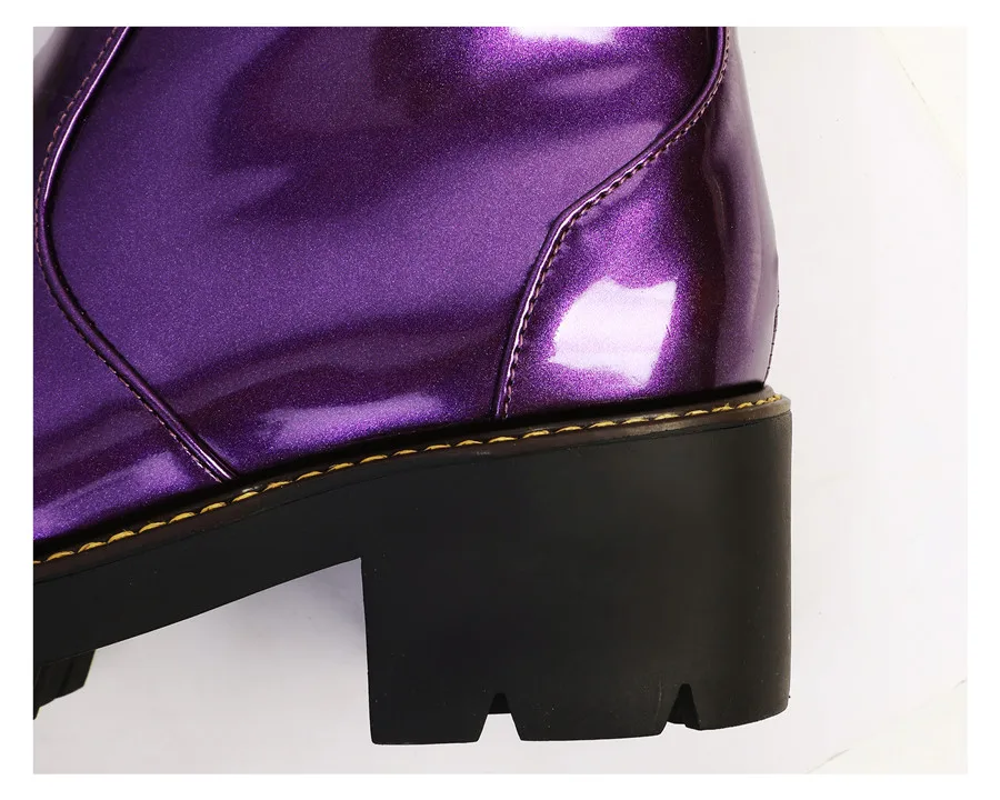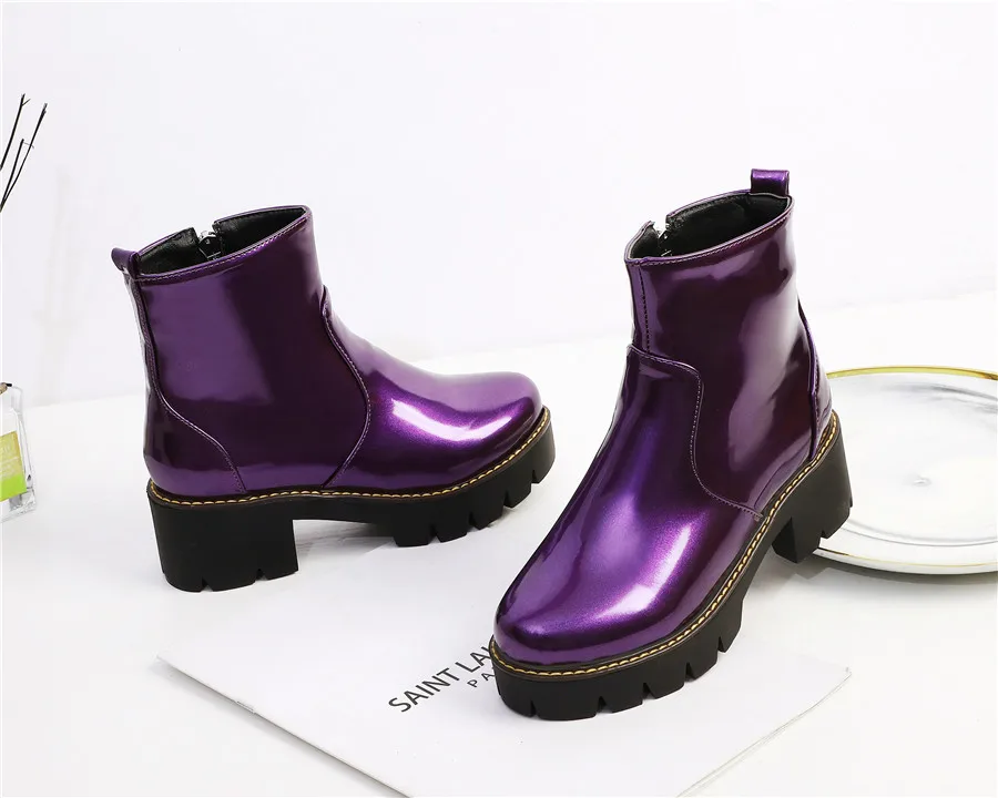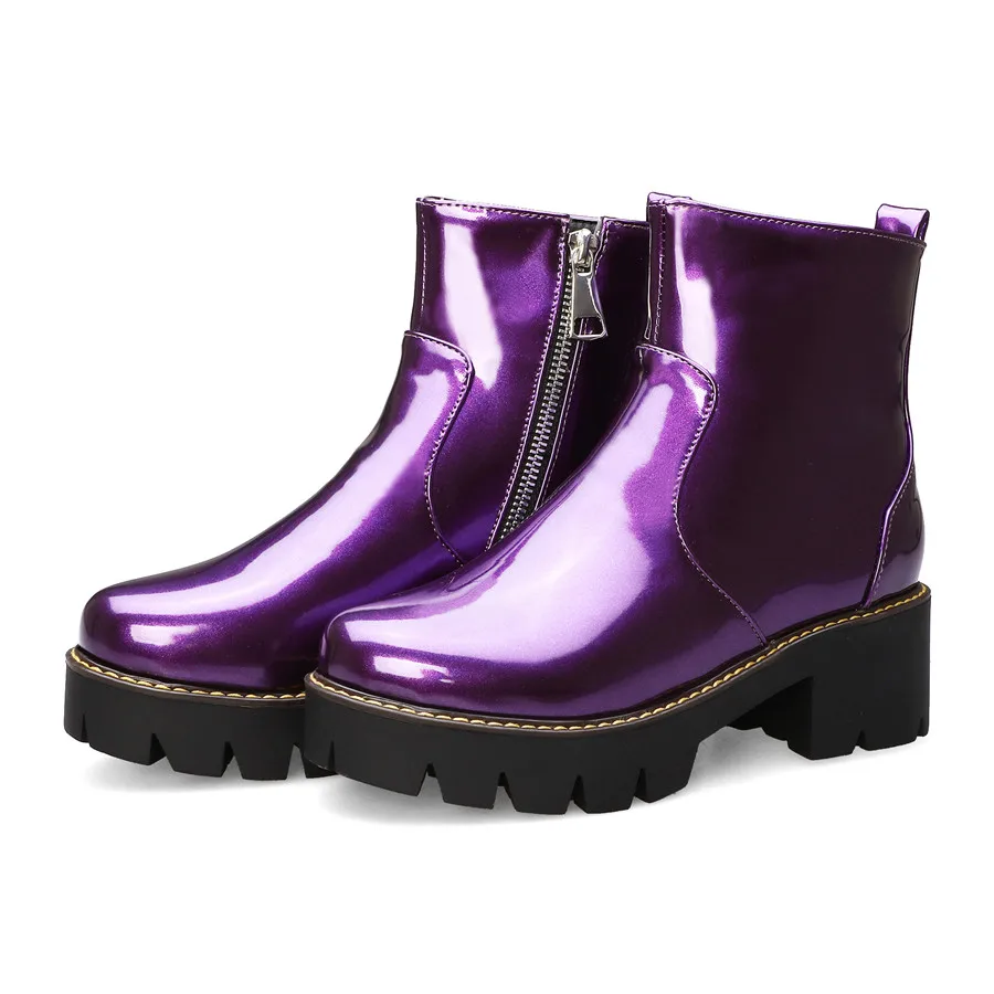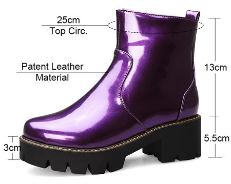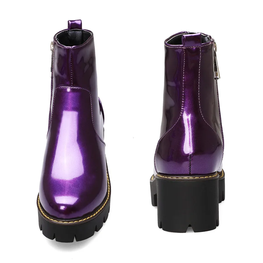 Black Purple Patent Leather Woman High Block Heel Combat Ankle Boots