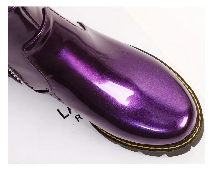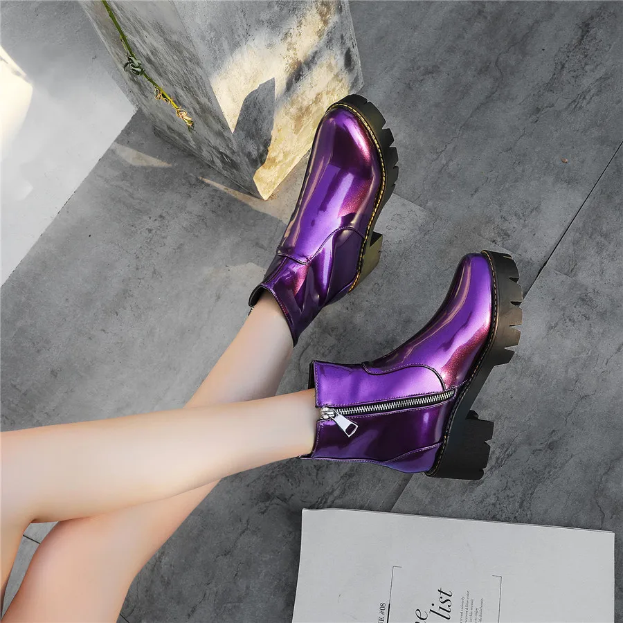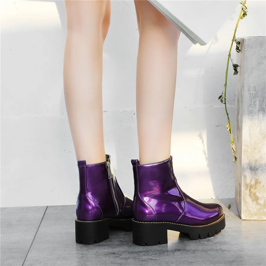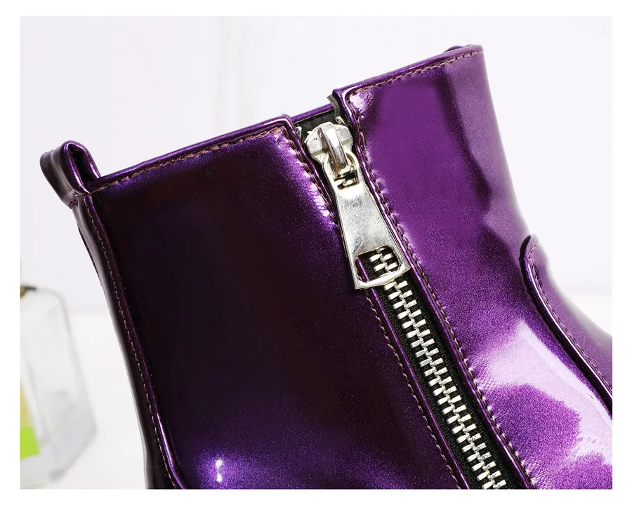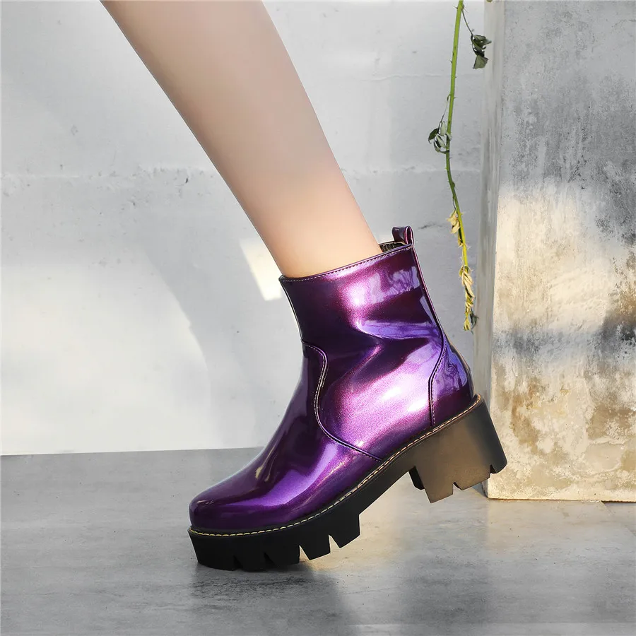 Black Purple Patent Leather Woman High Block Heel Combat Ankle Boots