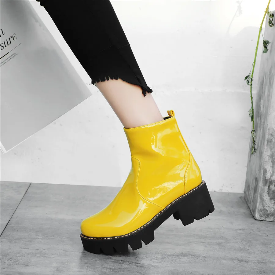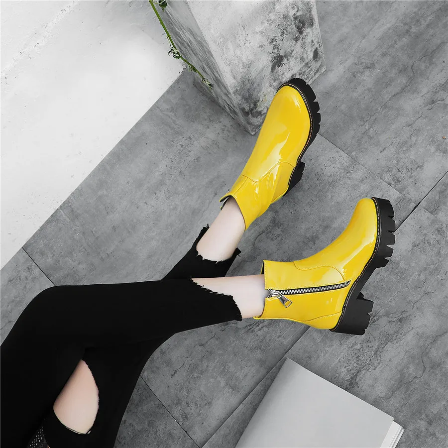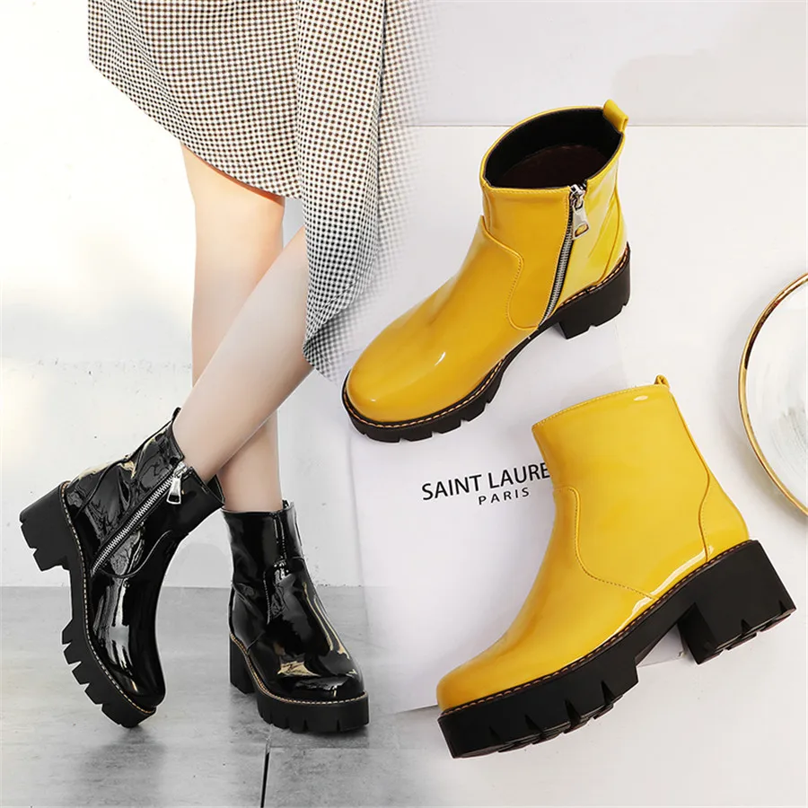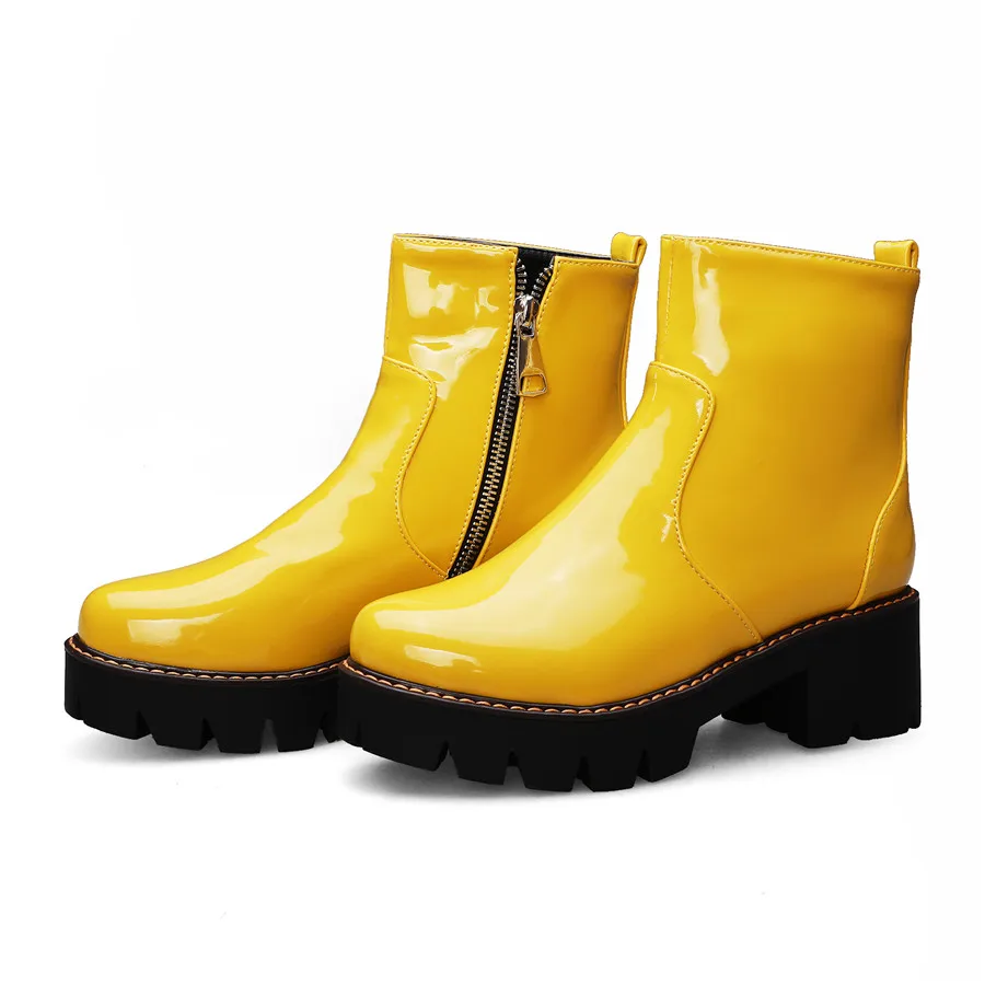 Winter Platform Ankle Boots Women High Thick Heels Yellow Black Patent Leather Office Ladies Plush Round Zipper Punk Short Boots