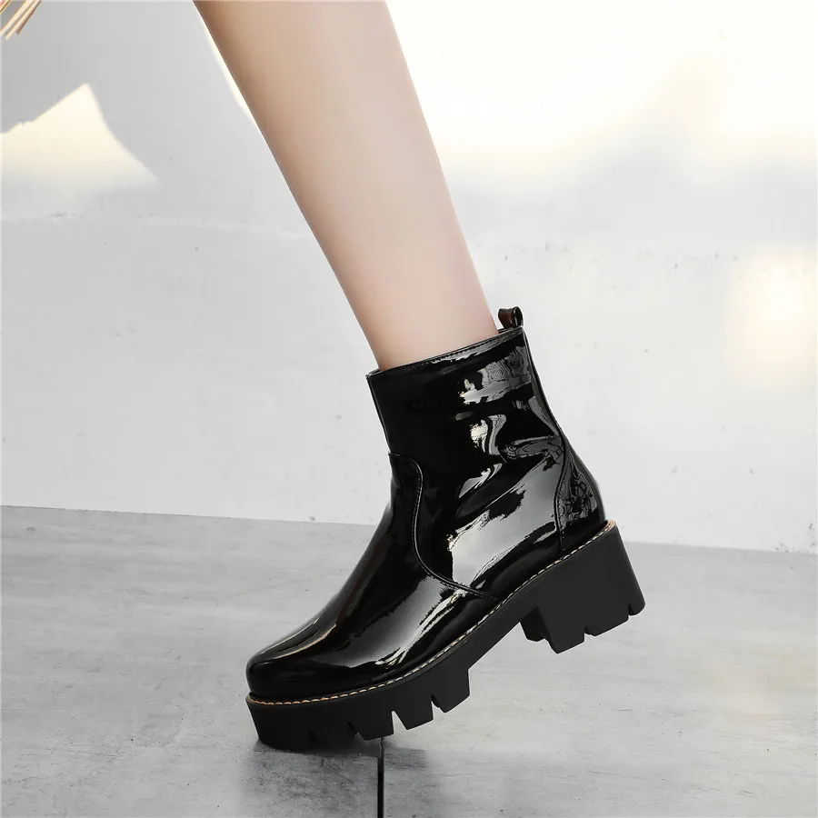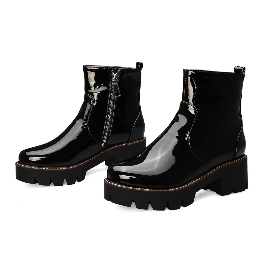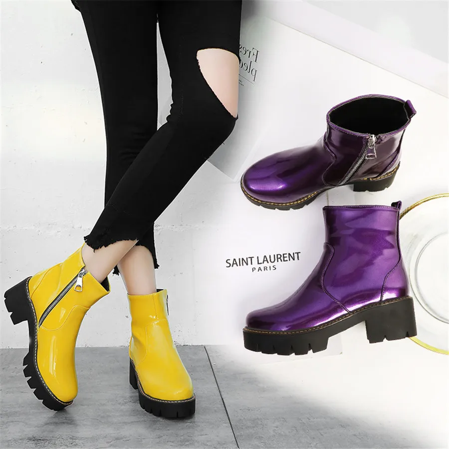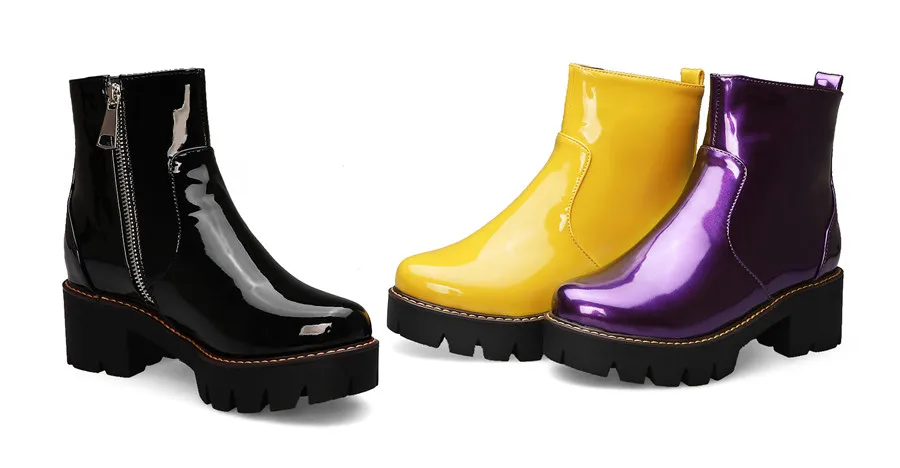 Winter Platform Ankle Boots Women High Thick Heels Yellow Black Patent Leather Office Ladies Plush Round Zipper Punk Short Boots