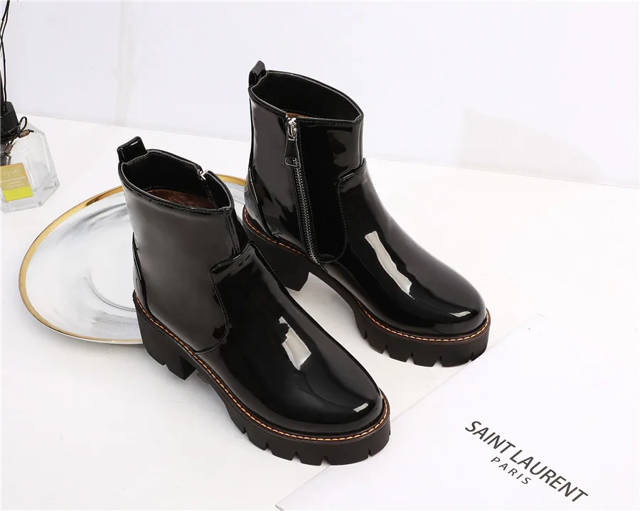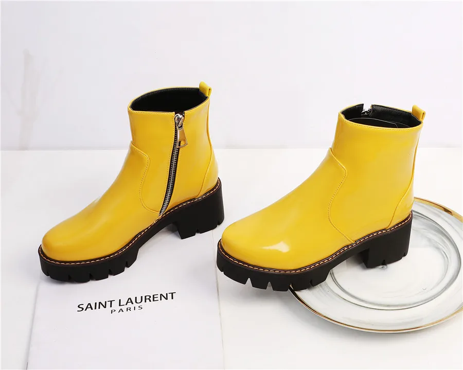 HomeAll productsWinter Platform Ankle Boots Women High Thick Heels Yellow Black Patent Leather Office Ladies Plush Round Zipper Punk Short Boots